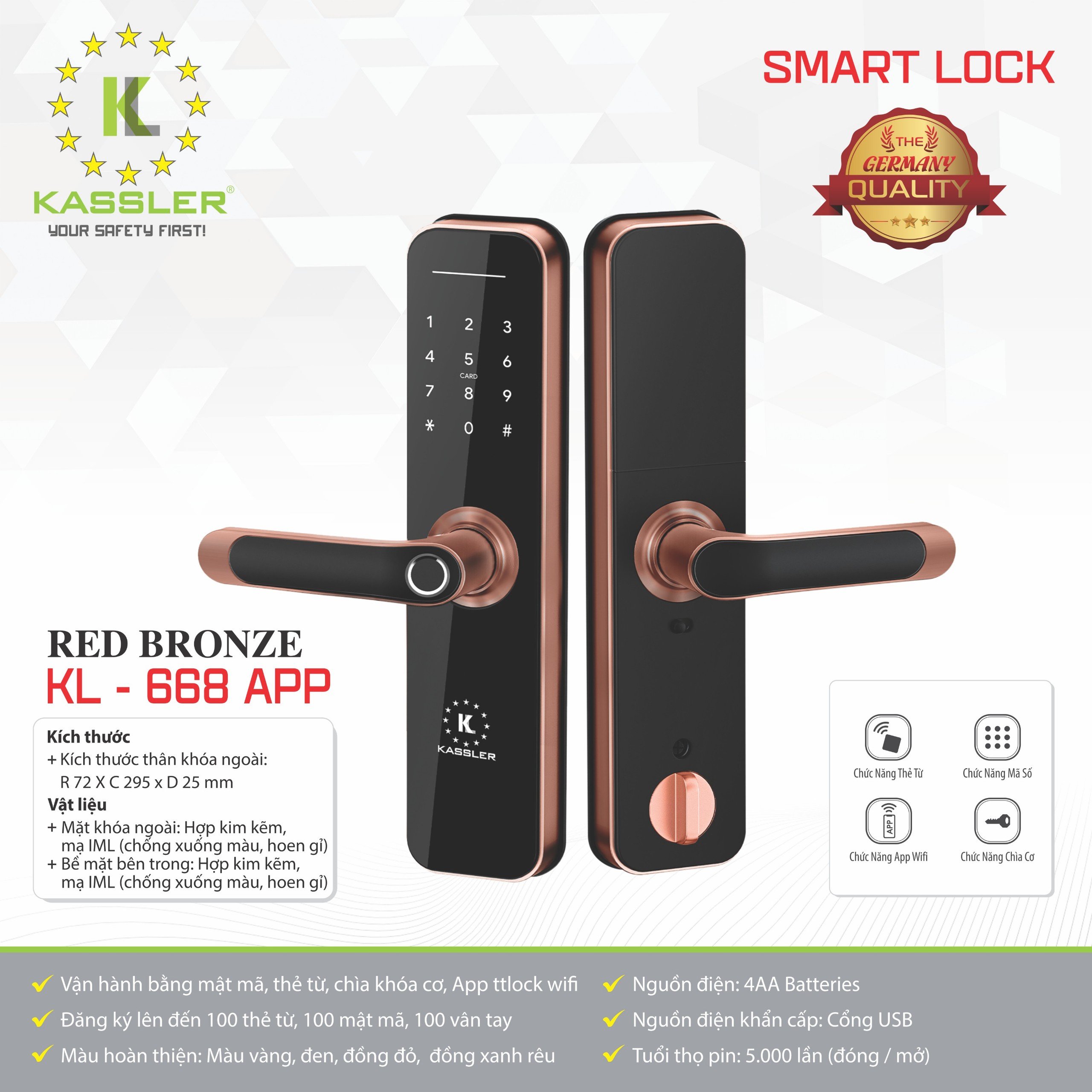 Kassler KL-668 là mẫu khóa vân tay cao cấp đến từ thương hiệu Kassler Đức, nổi bật với thiết kế sang trọng, đa chức năng mở khóa và độ an toàn vượt trội.