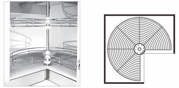 Mâm xoay inox mở 3/4 là sản phẩm có 2 sàn đựng bằng inox nan 304 cao cấp nhất, mỗi sàn đựng được thiết kế 3/4 của hình tròn để khi mở cánh tủ ta có thể mở được cánh tủ hoàn toàn 180 độ.